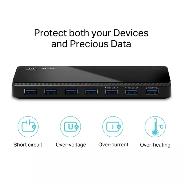 The hub is designed for convenience and safety. It features a sophisticated protection circuit to help guard connected devices against overheating, over-current, over-voltage, and short circuits. A built-in surge protector adds an extra layer of protection during data transfers. The UH700 also supports hot swapping, so devices can be safely connected and disconnected while the computer is running.
