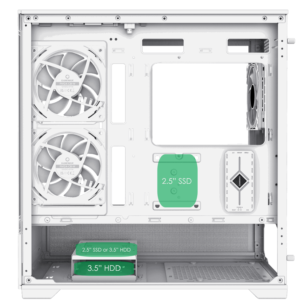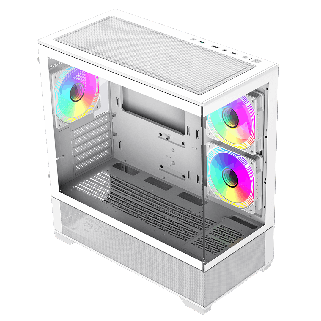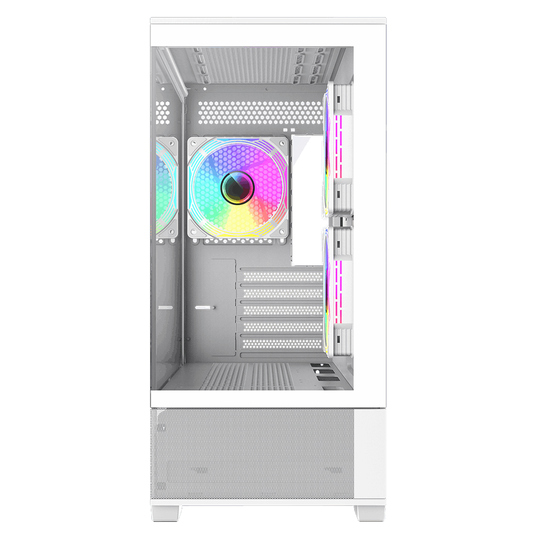 - Three GMX FN12A-C8I Infinity Fans Installed – This version of the GameMax Vista comes with 3 x 120mm FN12A-C8I White Infinity Fans installed, the luminous inner and outer ring design is impressive from the infinity centre to the outer ring design and the small detailing on the side of the fan frame gives a stronger three-dimensional sense creating a unique visual effect.