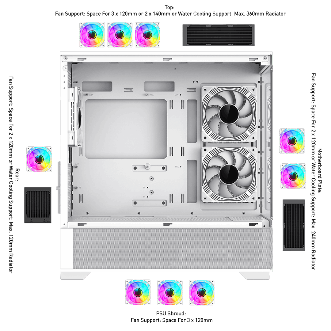- Outstanding Cooling – Support for up to nine fans in total Top: 3 x 120mm or 2 x 140mm Fans, Motherboard: 2 x 120mm Fans, Rear: 1 x 120mm Fan & PSU Shroud: 3 x 120mm Fans. The Micro-ATX casing can also house a 360mm radiator at the top keeping the internal temperature at an optimum level.