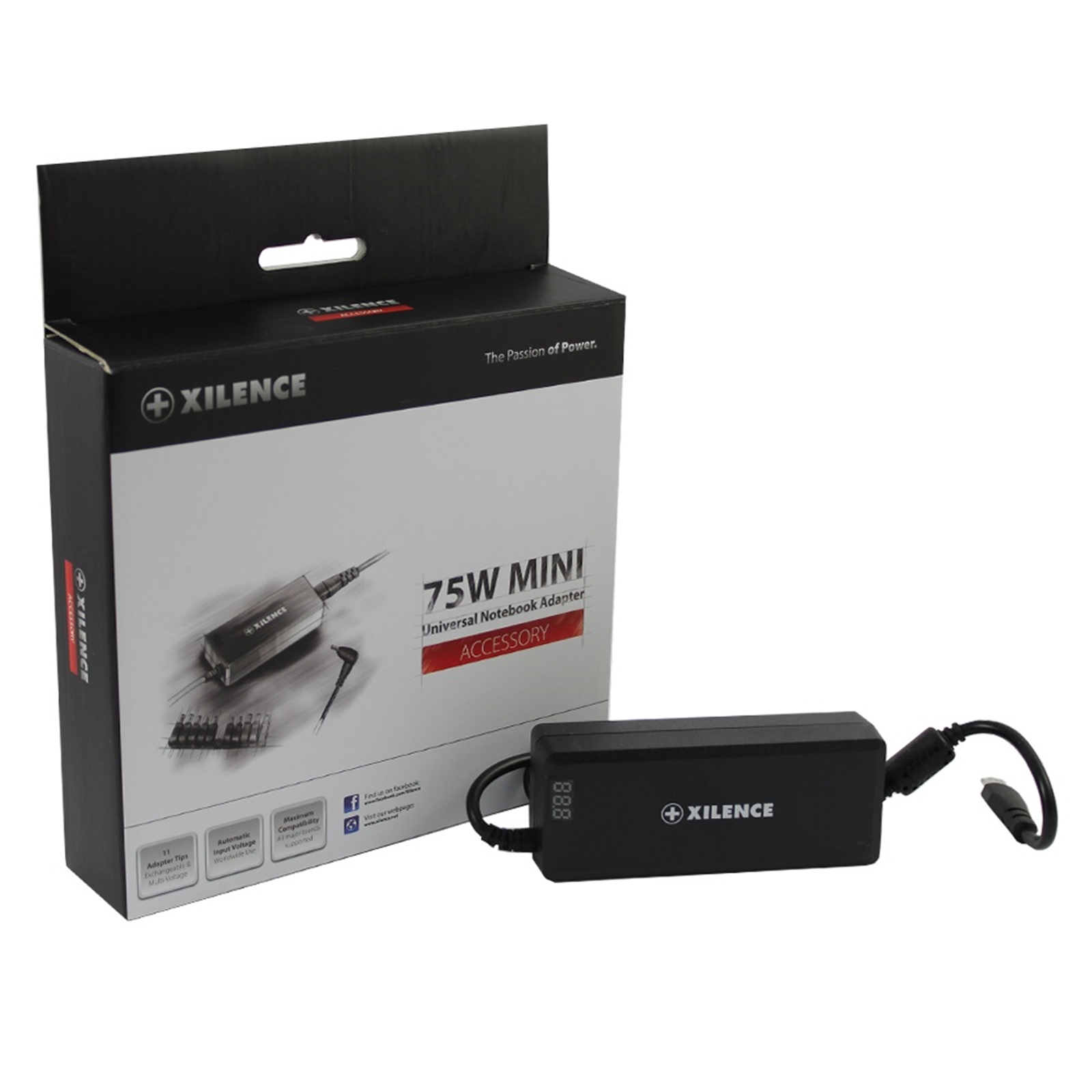 When looking at the new lightweight Xilence notebook PSU, it does not reveal its powerful interior. Nevertheless, the slim power pack has power with a stable output voltage of 24V. It achieves a remarkable efficiency of over 85%. The compact power pack includes eleven plug adaptors in order to supply the most popular notebooks and netbooks with power. The integrated LED display shows information on the output voltage at all times. Full-range allows the power supply to be used worldwide. The PSU reliably operates at input voltages between 100V and 240V.